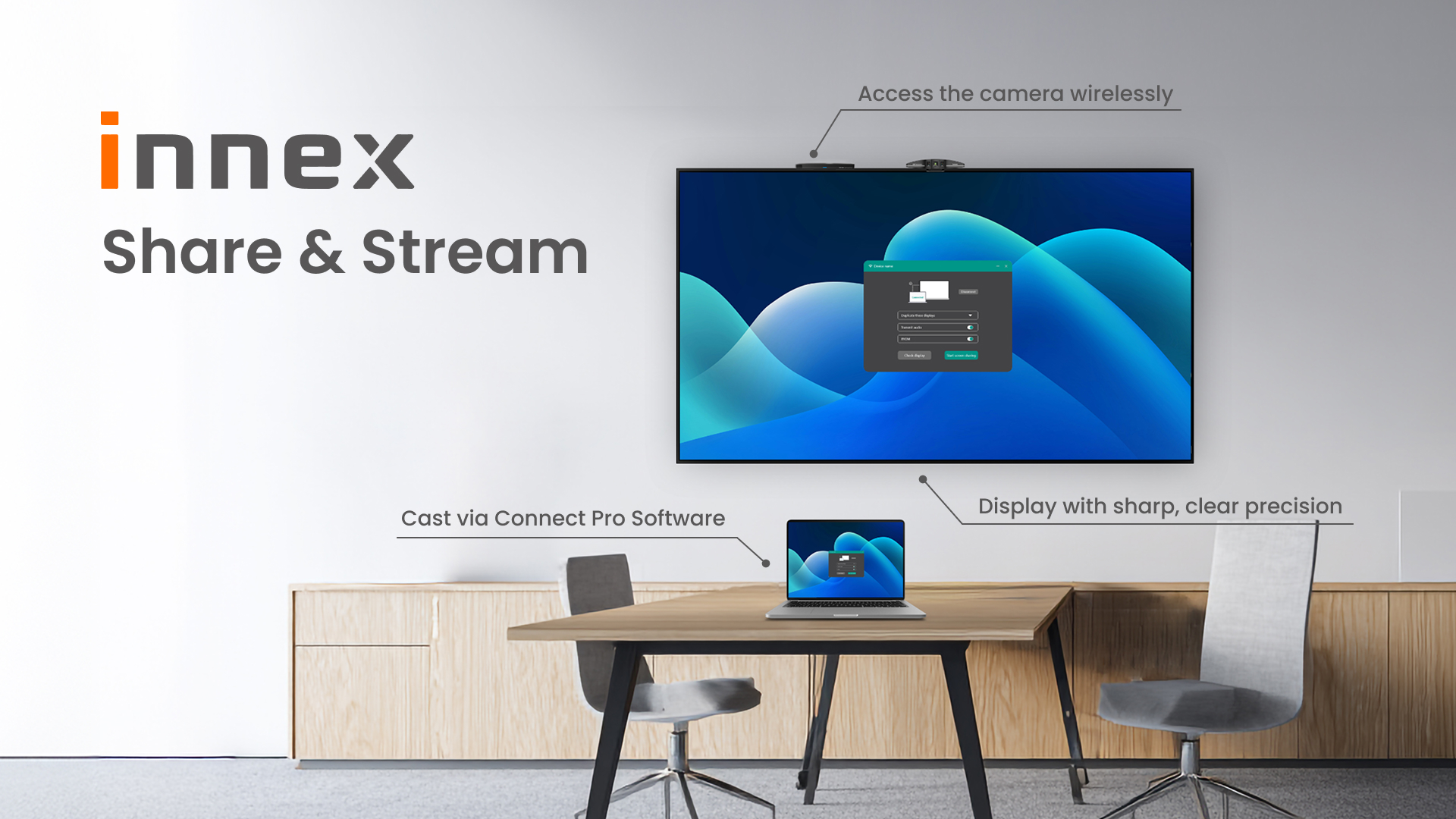 - Innex Connect Pro + – Share your screen your way. Choose the plug-and-play button, the Connect Pro software, or go with AirPlay, Miracast, or Chromecast. Whether you’re presenting to your team or a client, your presentation looks seamless and professional every time.