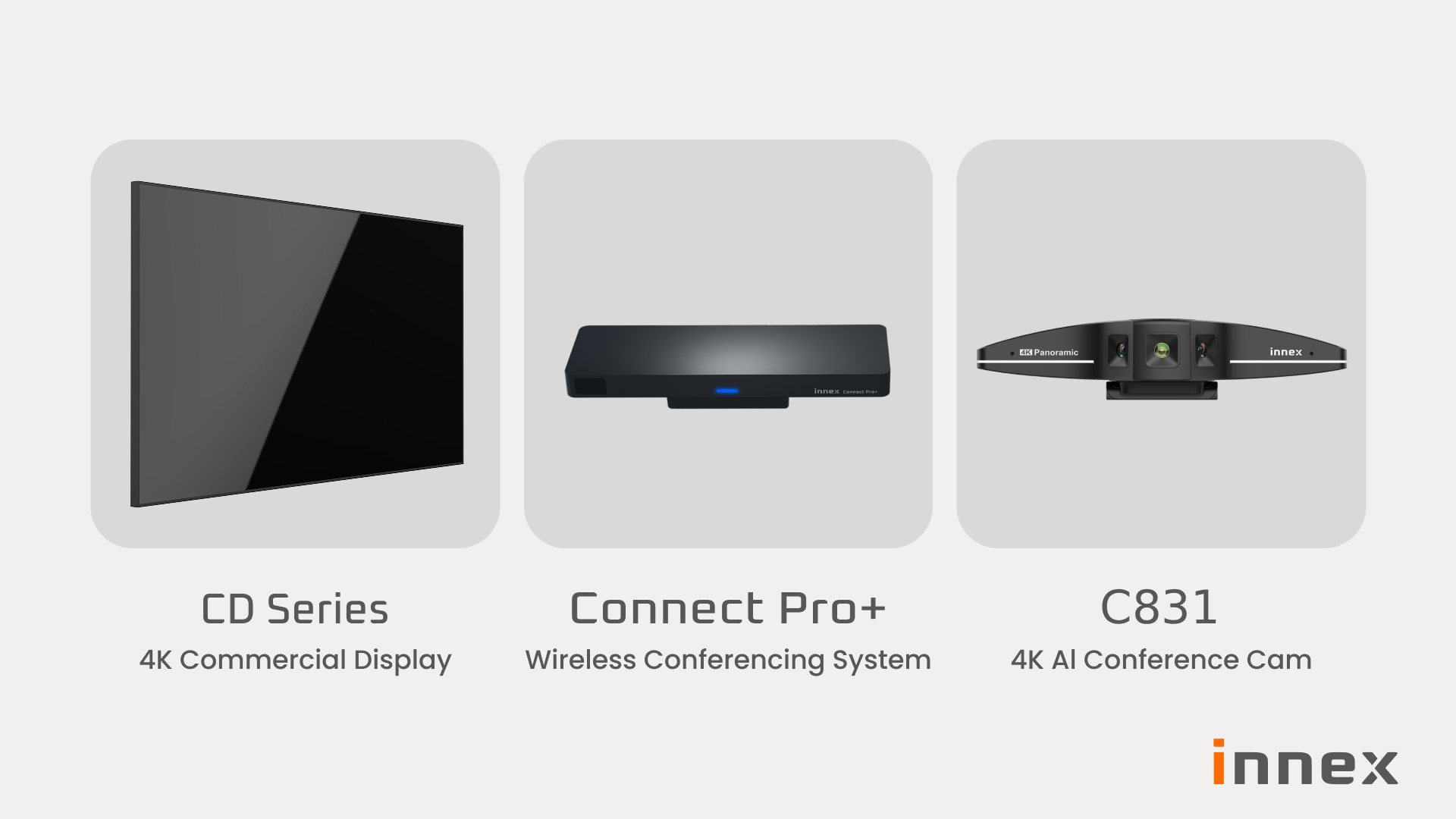 That’s exactly what Innex Share & Stream is designed for. This modern meeting set combines the sleek Innex CD Series display, Innex Connect Pro+, and C831 conference camera to deliver a streamlined meeting experience where sharing and video conferencing feel natural — no cables, no learning curve, no fuss.